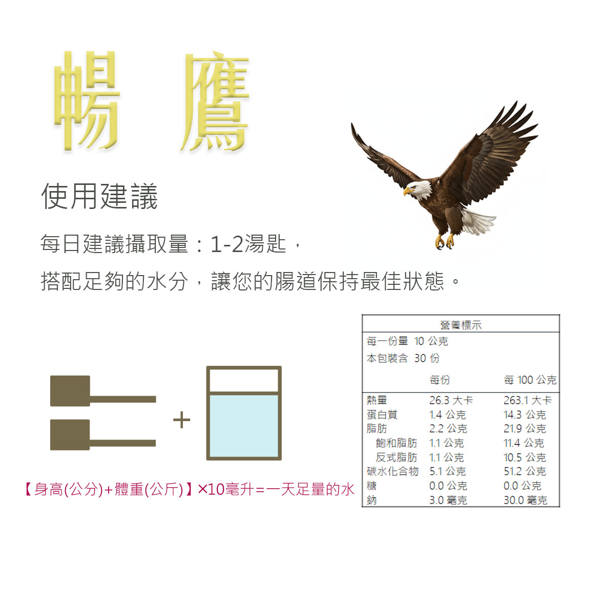 每日喝水量建議: 【身高(公分)+體重(公斤)】╳ 10CC