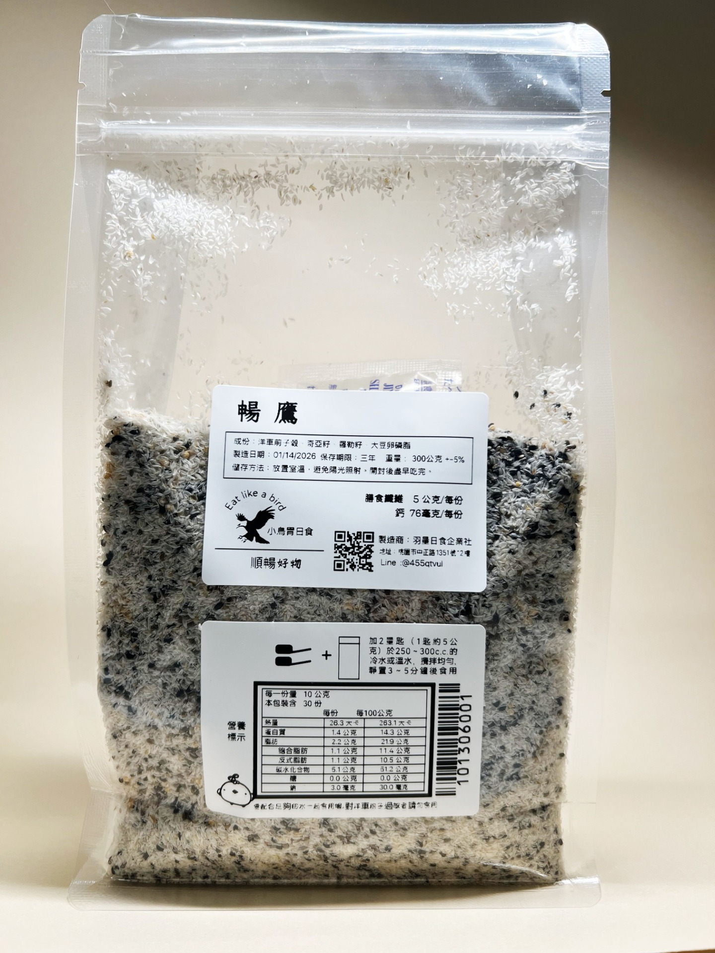 食用方式: 加入2匙(約5克)於溫水或冷水中。攪拌均勻,待5分鐘以上,呈現黏稠即可食用。